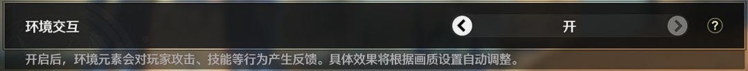 开启后,角色的攻击动作会与环境产生交互,比如激起水纹、扰动落叶、扰动植物的效果。很大的加强了游戏的沉浸感,效果很好。但是对设备负载很高,建议酌情开启