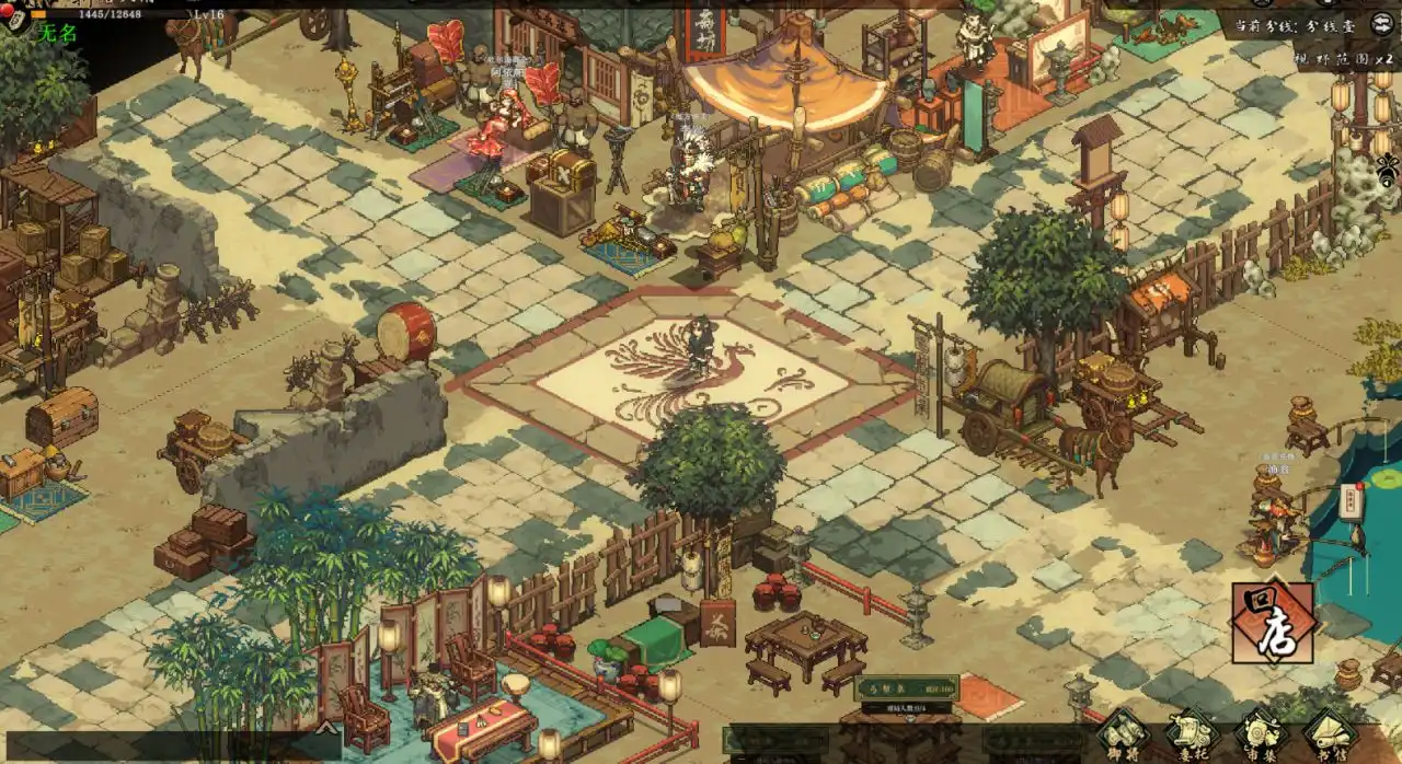 玩家可打造个性化客栈,内设柜台、货架、楼梯等设施,通过研发“杜康酒”“诸葛连弩”周边商品积累财富。市集场景中,可与“东方旅社老板”等NPC互动交易,解锁高级武将招募权限,形成“战场搜刮-市集交易-客栈发展”的策略闭环。