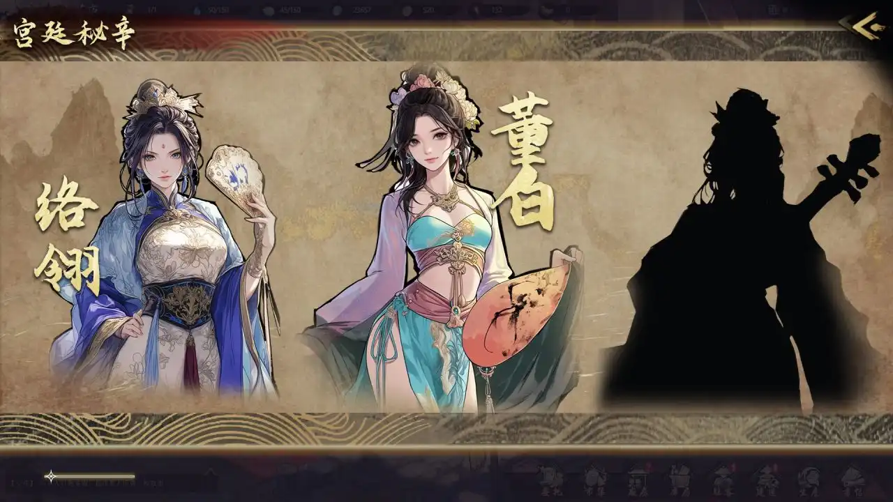 特别是这游戏的女性武将立绘,古典工笔技法展现细腻质感与灵动气质。女性武将立绘融合古典工笔与灵动气质。“络翎”梳高髻配金色发饰,蓝白相间服饰搭配深蓝色腰带,手持山水折扇;“董白”半披发插粉色花朵,青色抹胸长裙外罩淡紫色轻纱,腰间金粉腰封点缀,手持红色团扇。二人耳坠与发饰色彩呼应,艳而不俗,大家觉得如何?