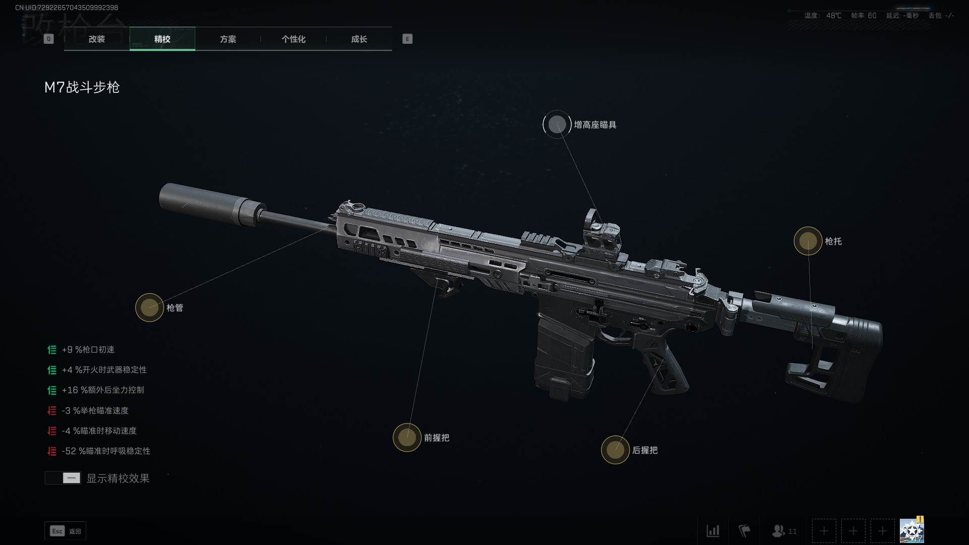 另外这【斜角阻手器】+【骨架狙击枪托】+【幻影后握把】三个配件的共同点是,在精校时都可以获得额外的后坐力控制。这套方案可以让M7获得16%额外后坐力控制4%开火时武器稳定性。