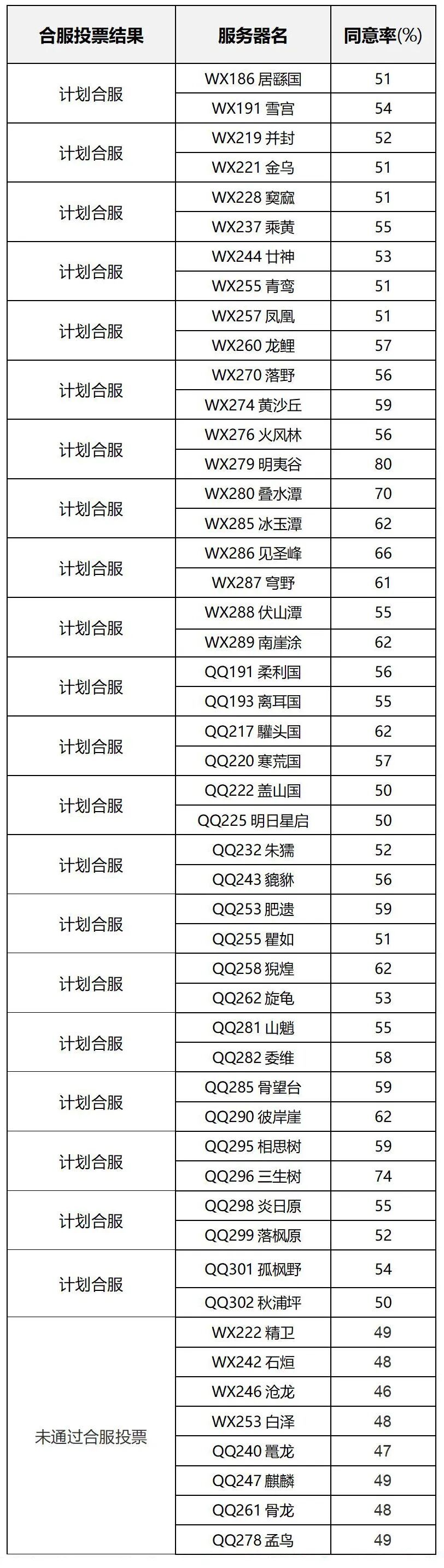 近期合服投票通过区服公示如下: