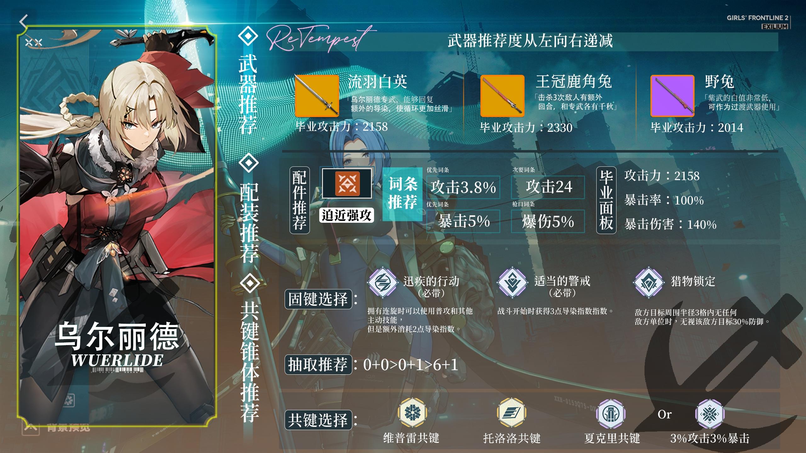 接着就是复刻的乌尔丽德,虽然在跃键加强后的满椎已经达到了尼基塔水平,但是高度绑定幼熙,而且仅能对单。属于是对于xp党非常不错的加强了。由于下版本会有黛烟的第二跃键,0椎黛烟也可能迎来较大加强,如果是物理队缺人的指挥官可以在xp中0椎二选一。