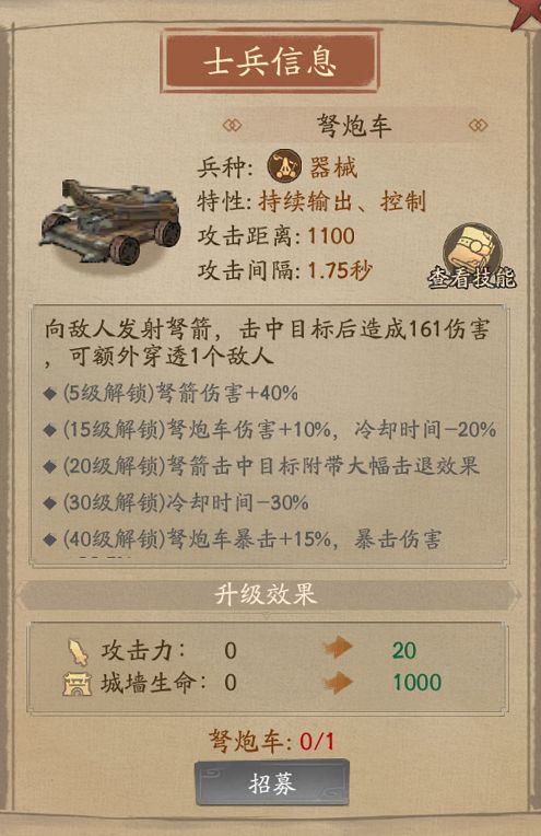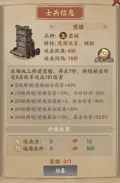 核心技能【布防工事】及后续技能则能够稳定的给敌人降低大量攻击,可极大缓解城墙的生存压力。