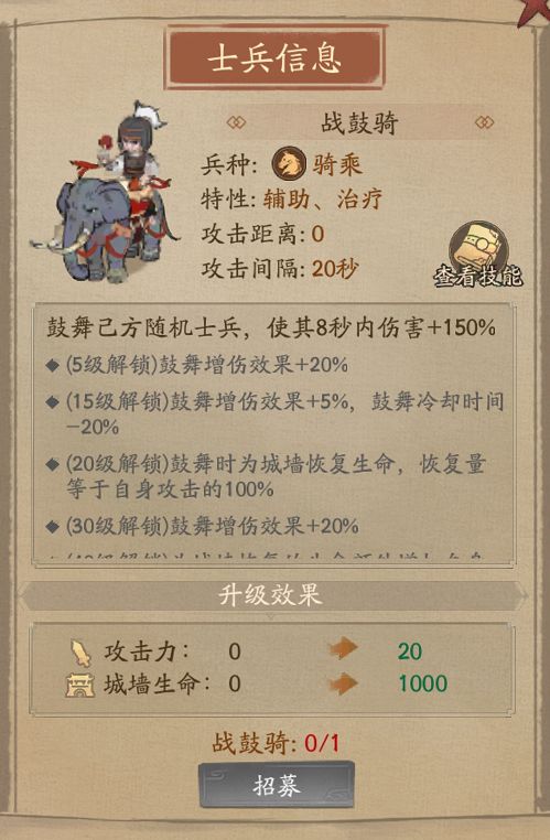 无法攻击敌人,但会鼓舞己方士兵,增加其士兵攻击力,是专职辅助的士兵。较长的CD以及无法鼓舞所有士兵是战鼓骑的缺点,在战斗中升级技能可弥补这一缺陷。