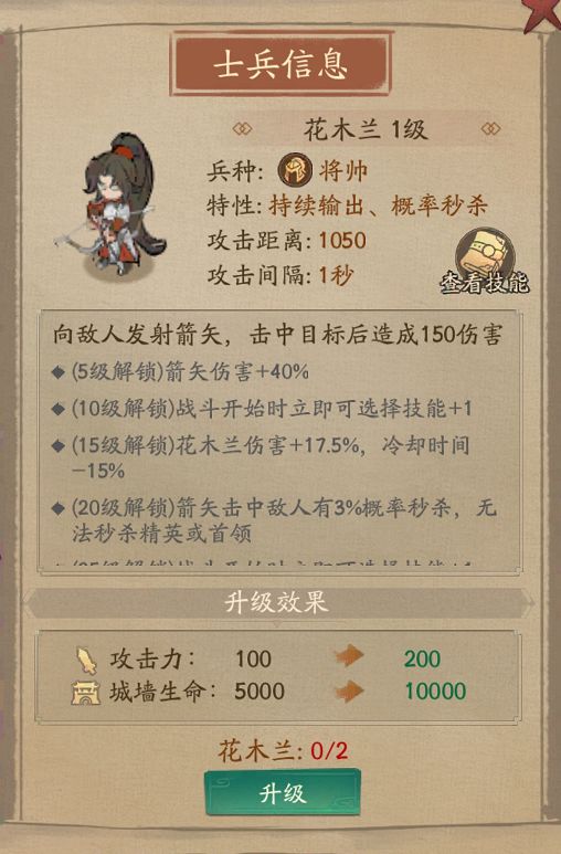 作为主将,每次战斗必定会出战。射出箭矢攻击敌方,拥有较稳定的持续输出能力。在大本营中升级花木兰,还可解锁战斗开始时立即升级技能的机会。