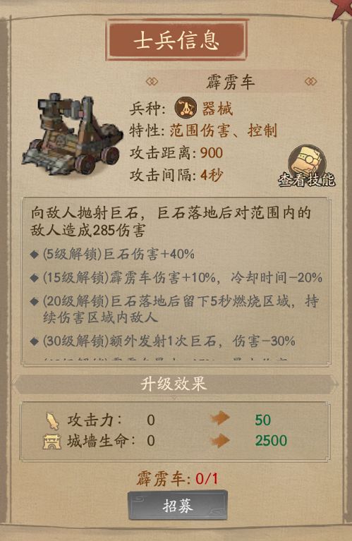 投掷巨石攻击范围内的敌人。霹雳车的攻击间隔较长,但伤害较高,并且升级技能大多增强伤害能力,可作为队伍的主力输出手。