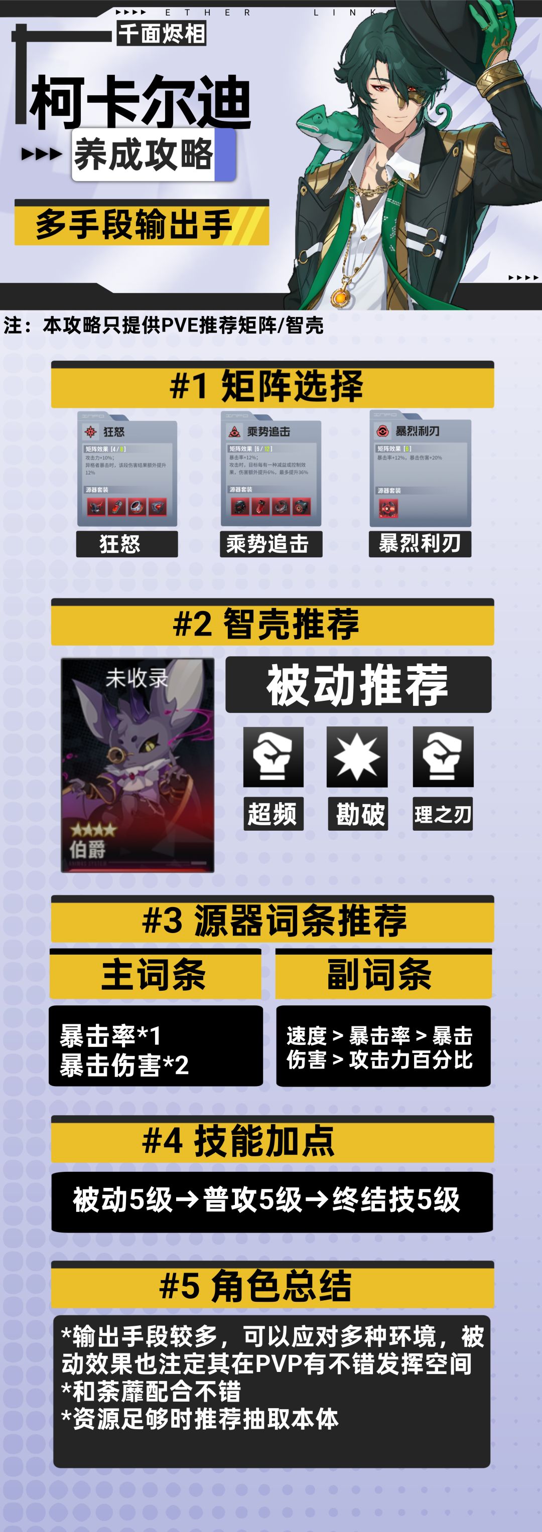 由于科卡尔迪的被动效果需要暴击才能够触发,因此一号位推荐狂怒,暴击时能够增伤,二号位推荐乘势追击,三号位推荐暴裂利刃补足自身暴击率,此时矩阵就提供了24%的暴击率,再搭配智壳、源器还有终结技的暴击率上升即可轻松满暴