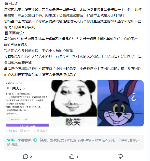 最后我也不知道他挂个赞助截图想表达啥,群里面玩家应该看过很多次,每次新玩家问我“怎么赞助”,“哪个赞助性价比高”,我从来都是推荐不用赞助,游戏内容基本都可以刷,资源和爆率也够,实在想赞助也先体验完剧情第一章,觉得还行再考虑赞助。