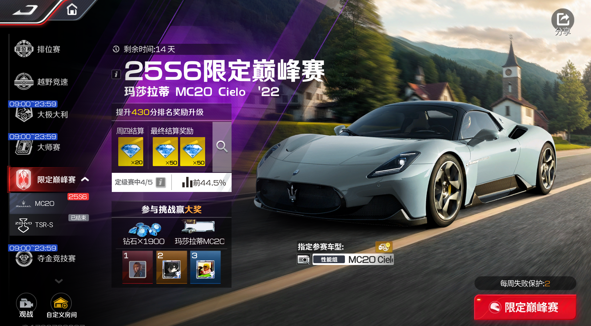 国庆假期别忘上线领免费十连抽,还有25S6限定巅峰赛等你来参与!驾驶玛莎拉蒂 MC20 Cielo '22参与挑战,最高能够获得1900钻石、MC20聊天气泡等好礼~小极已准备好假期冲击大奖,车手们快跟上一起出发吧!