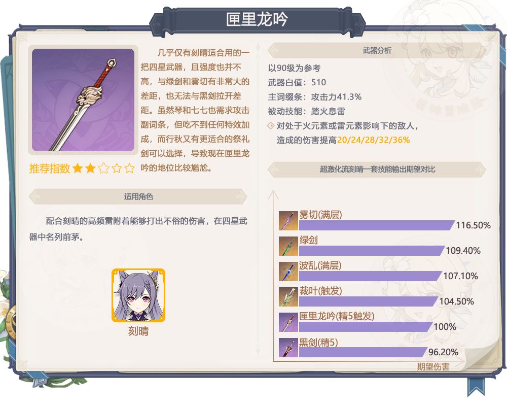 四星【匣里龙吟】【西风大剑】【西风长枪】【西风秘典】【祭礼弓】“获取推荐”评级标准:★★★★★:无可替代,关键卡必抽