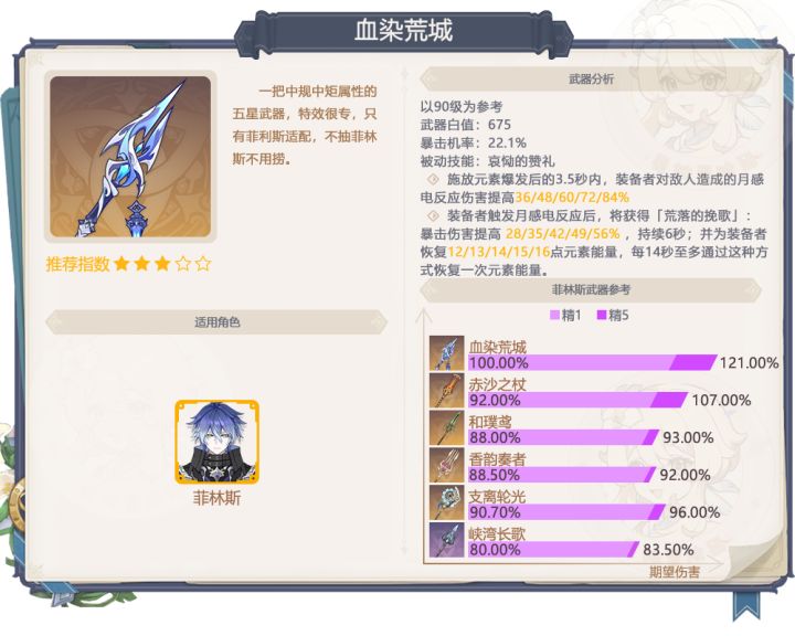 ★☆☆☆☆:还没开发出满意玩法,不建议抽取1、血染荒城抽取建议:抽菲林斯非常推荐抽这把专武,虽然输出相差不多的下位替代不少,但武器有独有的特效能量恢复对菲林斯的帮助非常大