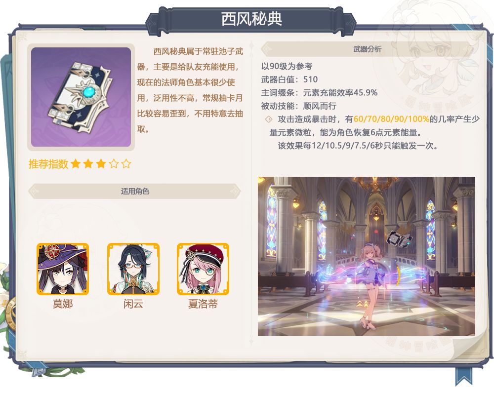 6、西风秘典抽取建议:常驻武器,比较不错的充能武器,泛用性一般,很容易在限定池和常驻池抽到,没必要特意去抽取