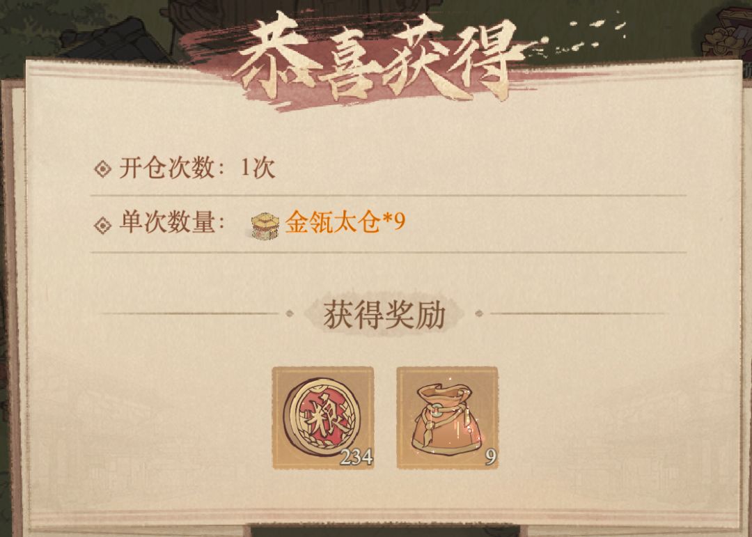 活动的核心是消耗道具 “丰仓官契”(相当于抽奖券),去开启一个九宫格粮仓。