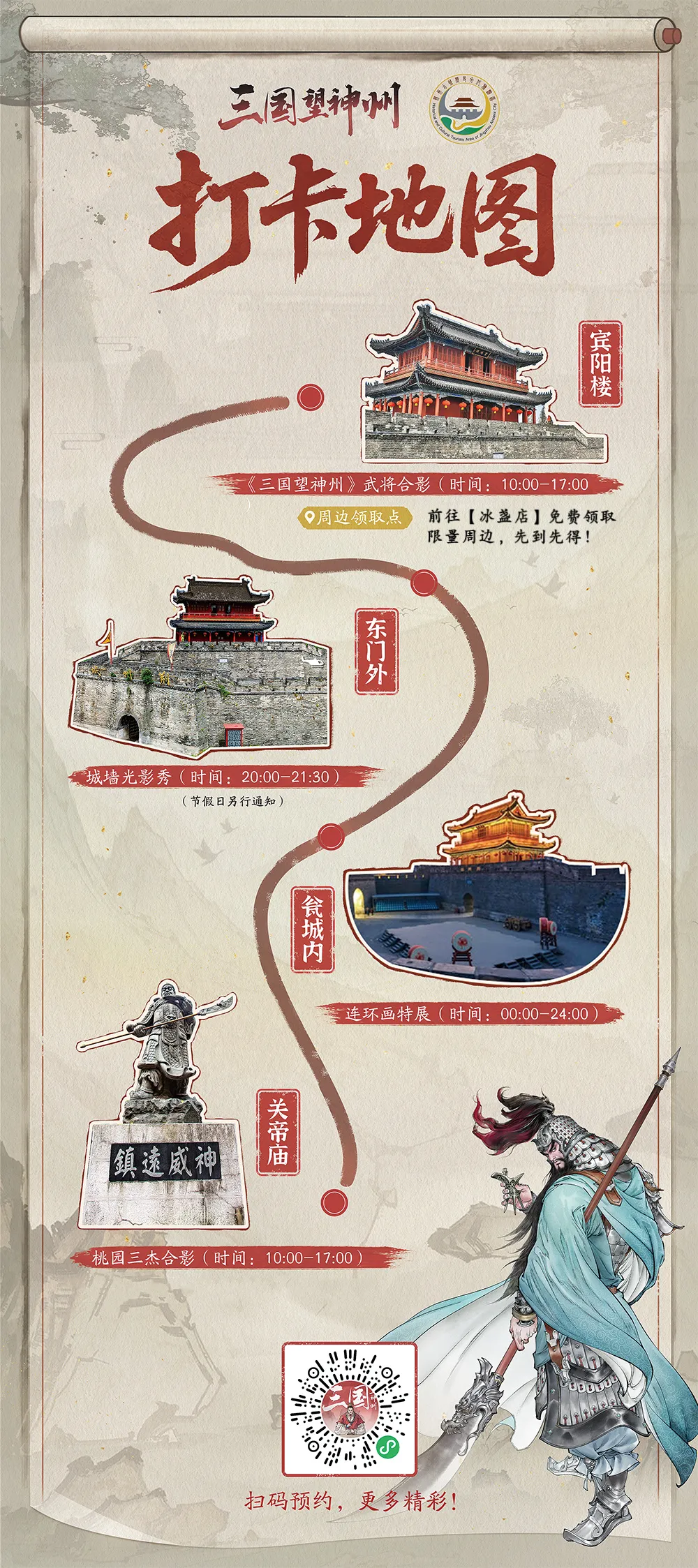 三国望神州×荆州古城联动现场前往荆州的明公,可以根据下方地图指引,游历荆州古城,打卡赢取周边好礼。