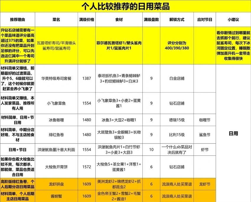 如果记不住也没关系,先上贵的菜,后面用便宜的菜来自动供应,自动供应会浪费一道菜,所以用便宜的凑数 3.餐厅升级指南升级主要看几个方面:料理研究(用匠人之火解锁),关注餐厅的粉丝数(营业得到),菜品的味道评分值(升级菜谱提高)