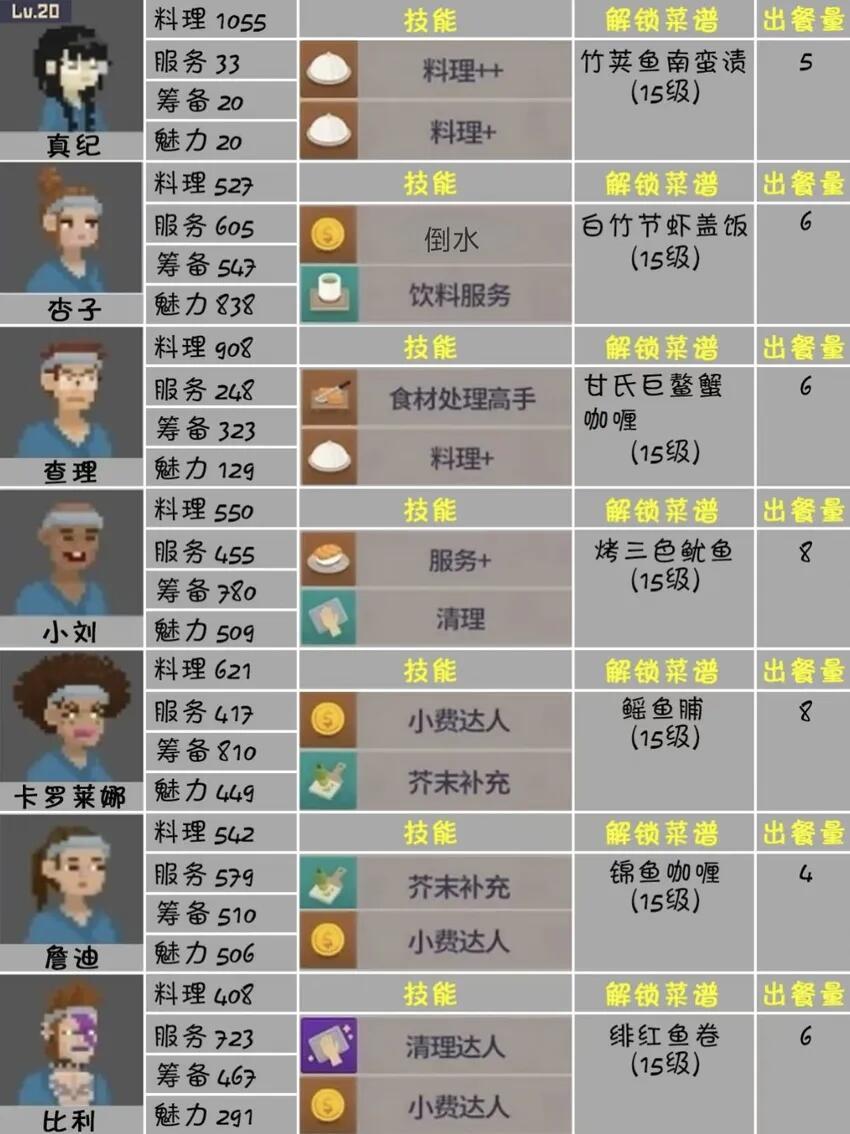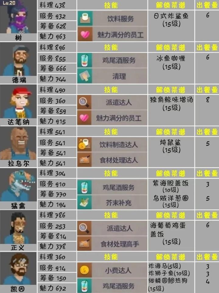 经理:瑞德(料理大于500服务数值高)