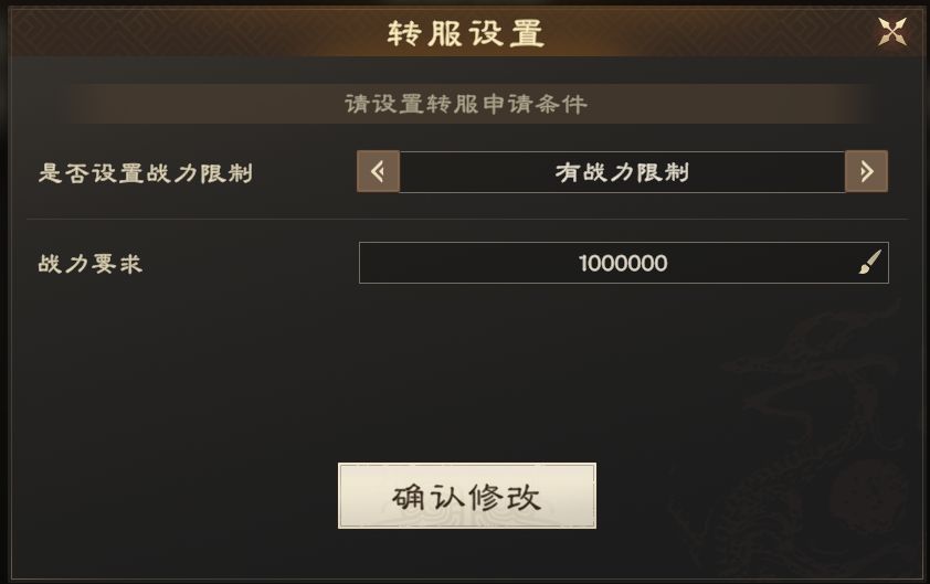 【申请战力下限】是由皇帝设定的允许申请的转服玩家最低战力,低于该战力的玩家不允许转入该国家。皇帝可通过设置下限值,避免未经沟通的领主进入王国,也能避免被大量申请所打扰。点击“转服管理”界面的【设置】按钮来设置下限值,默认是不设限制。