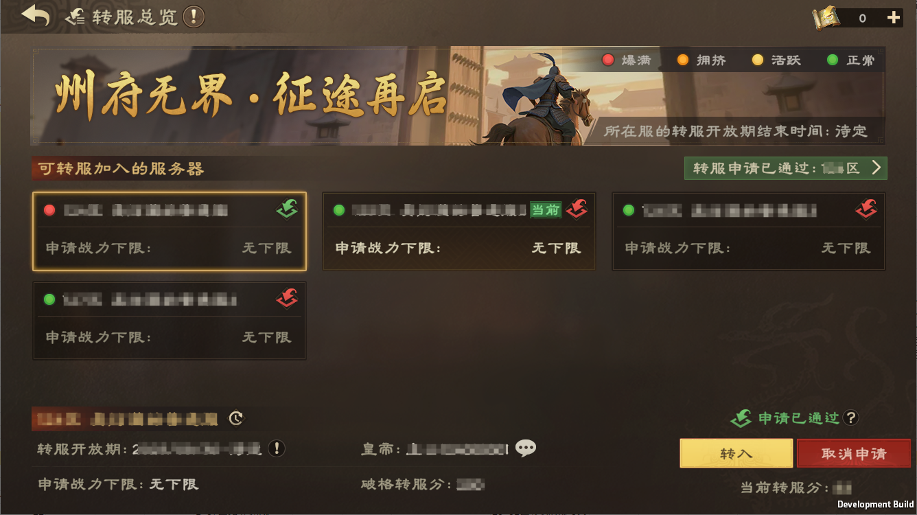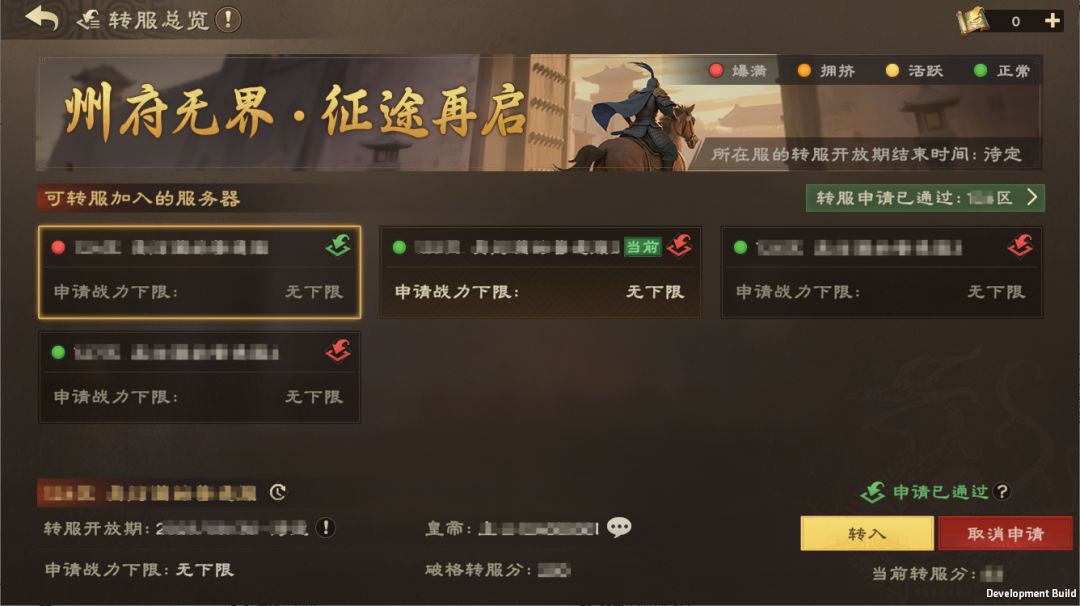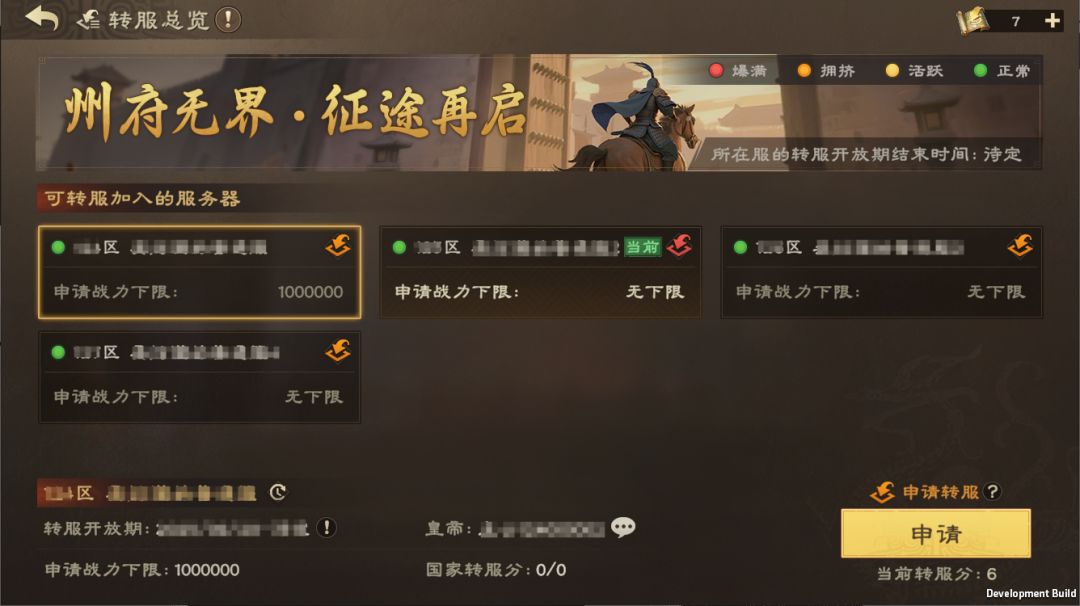 点击后,在“转服总览”界面,满足转服条件后可以向心仪的目标服务器提交申请。(若主公的战力低于一定战力(S1:4,000,000),则无需经过审批,也不占用目标服的移民名额)