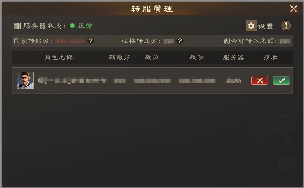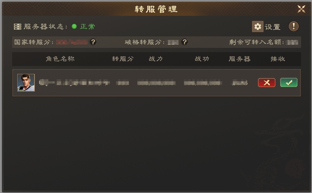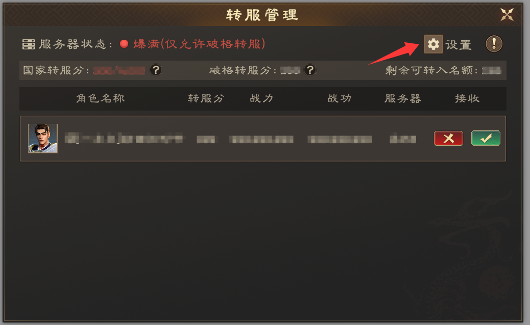 2. 皇帝审批:仅皇帝有权对对转服申请进行审核,决定是否批准。点击“转服总览”界面点击【转服管理】功能入口,可查看收到的转服申请。