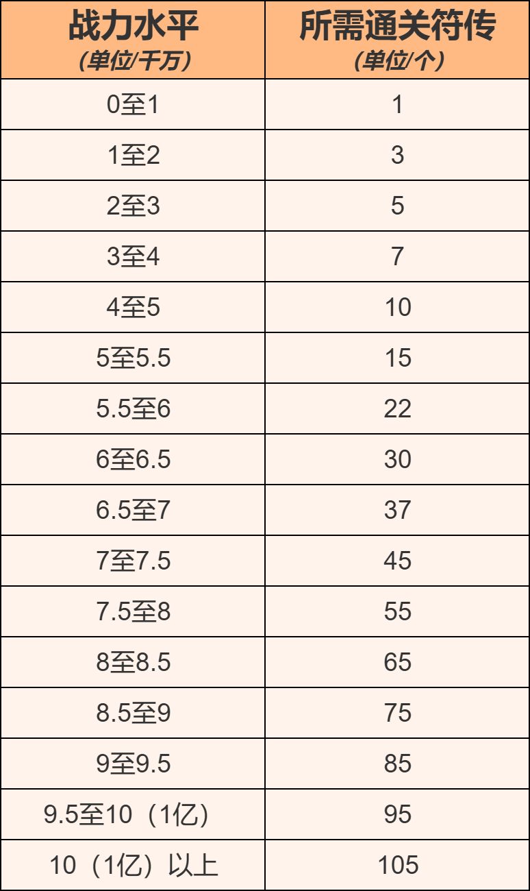 7. 拥有足够的通关符传道具,角色战力与所需数量的对应关系如下: