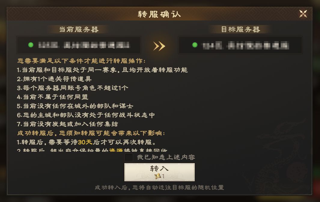 1. 角色所处服务器与转入目标服务器必须处于同一赛季,且两个服务器的转服功能均处于开放状态