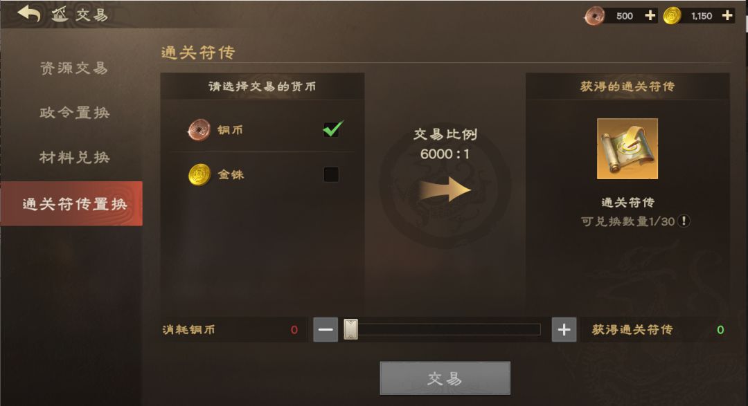 1. 在内城市场的交易功能内,在【通关符传置换】页签通过金铢或铜币进行兑换。