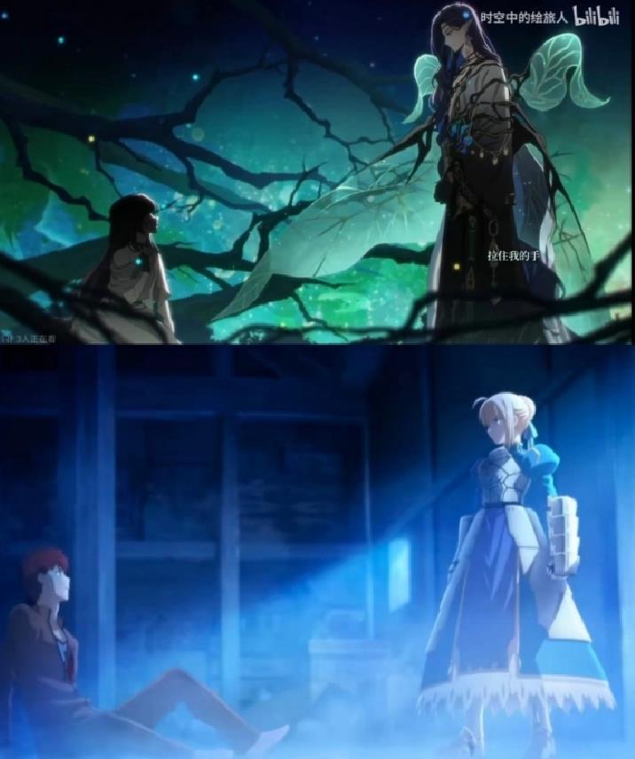 绘旅人pv里出现的fgo名场面构图。绘旅人这次重点争议倒不是美术,像这类构图和人物形象塑造,其他游戏可以都找到更像fgo的。主要是剧情上的细碎的人物设定,剧情框架实在有太多的fgo2.6的既视感。