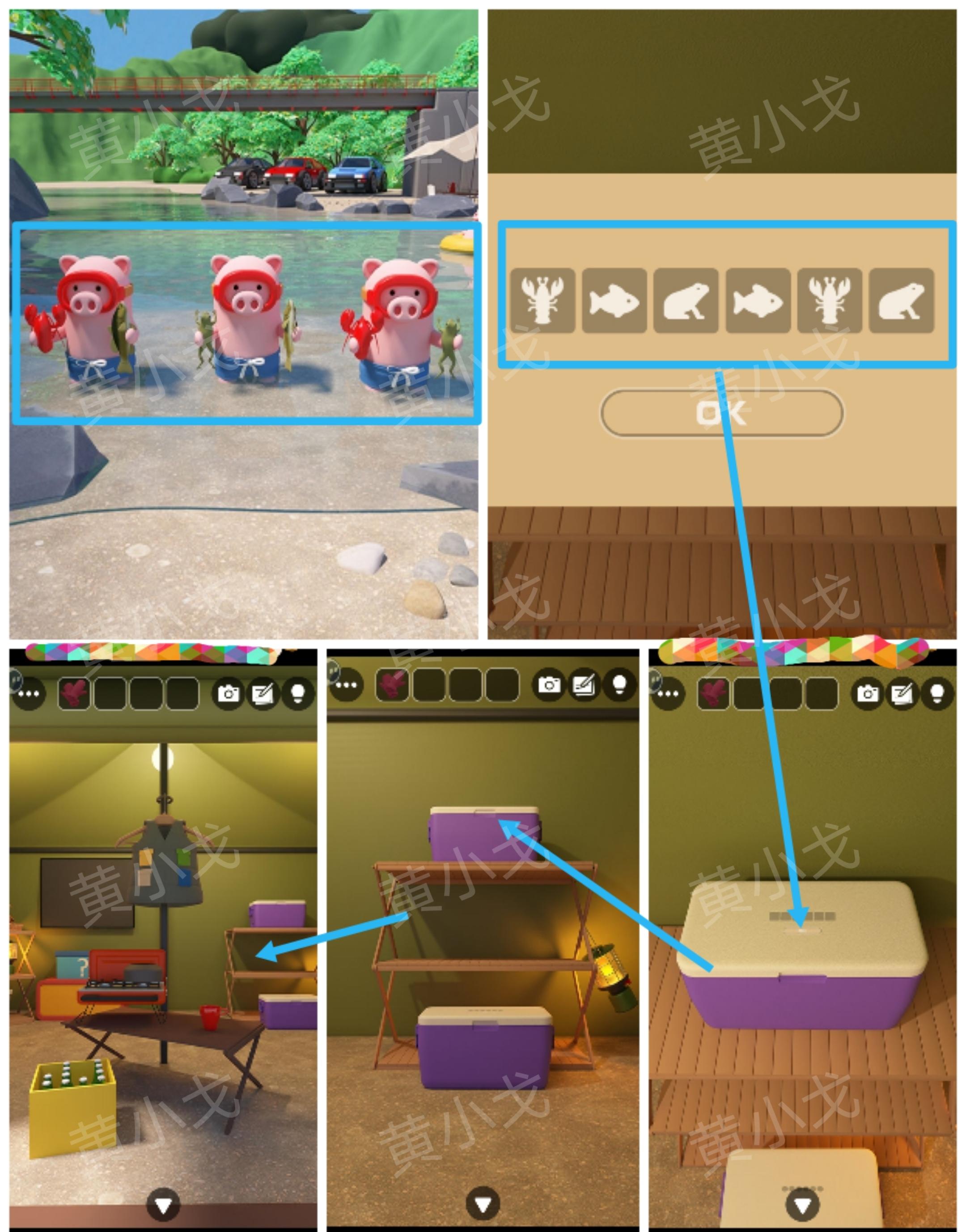 4.点击蓝色盒子上的密码锁,根据[大场景]螃蟹位置线索,调整密码锁