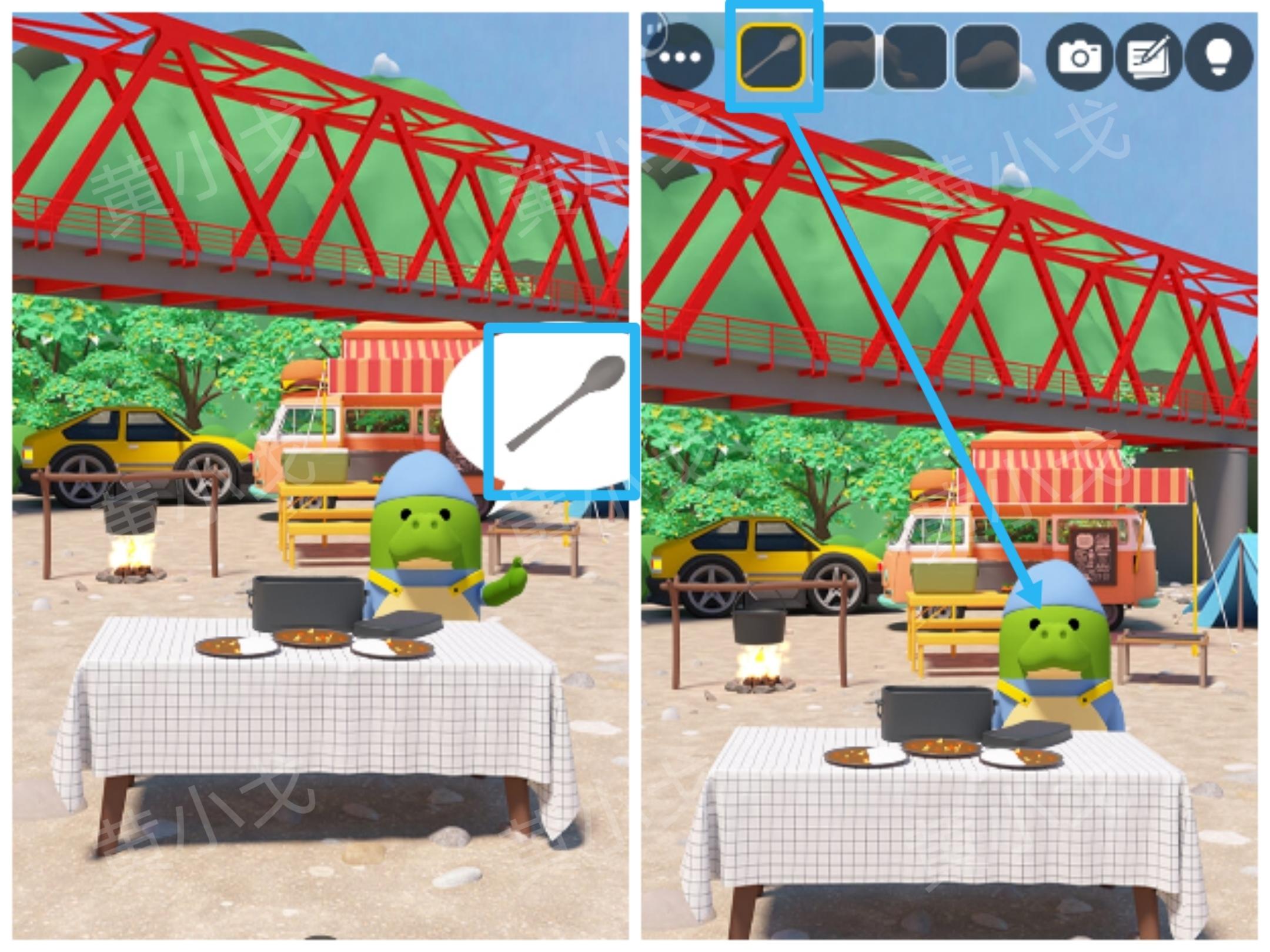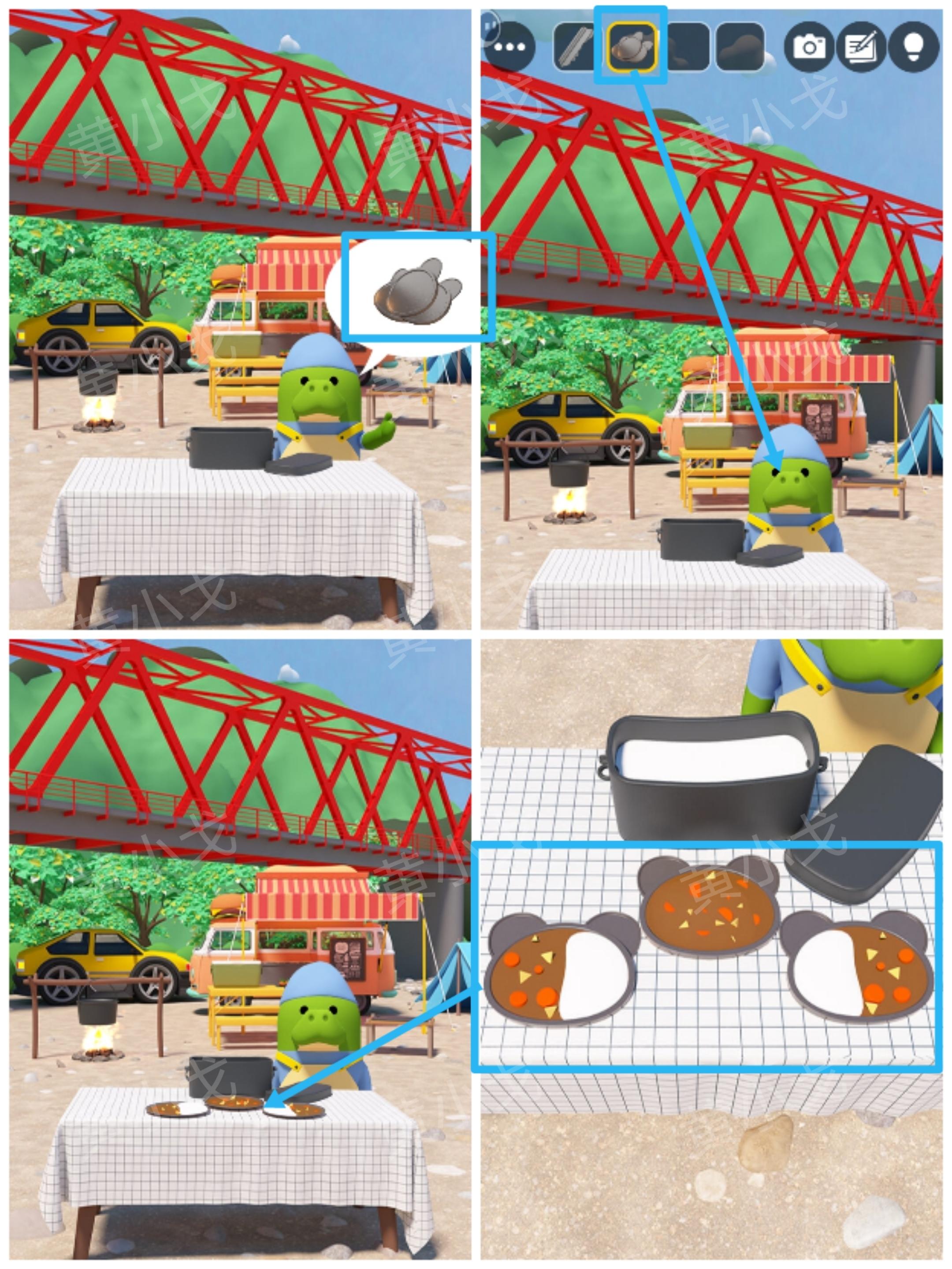 1.点击帐篷上的密码锁,根据锅里的咖喱材料颜色分布位置,调整密码锁,打开帐篷