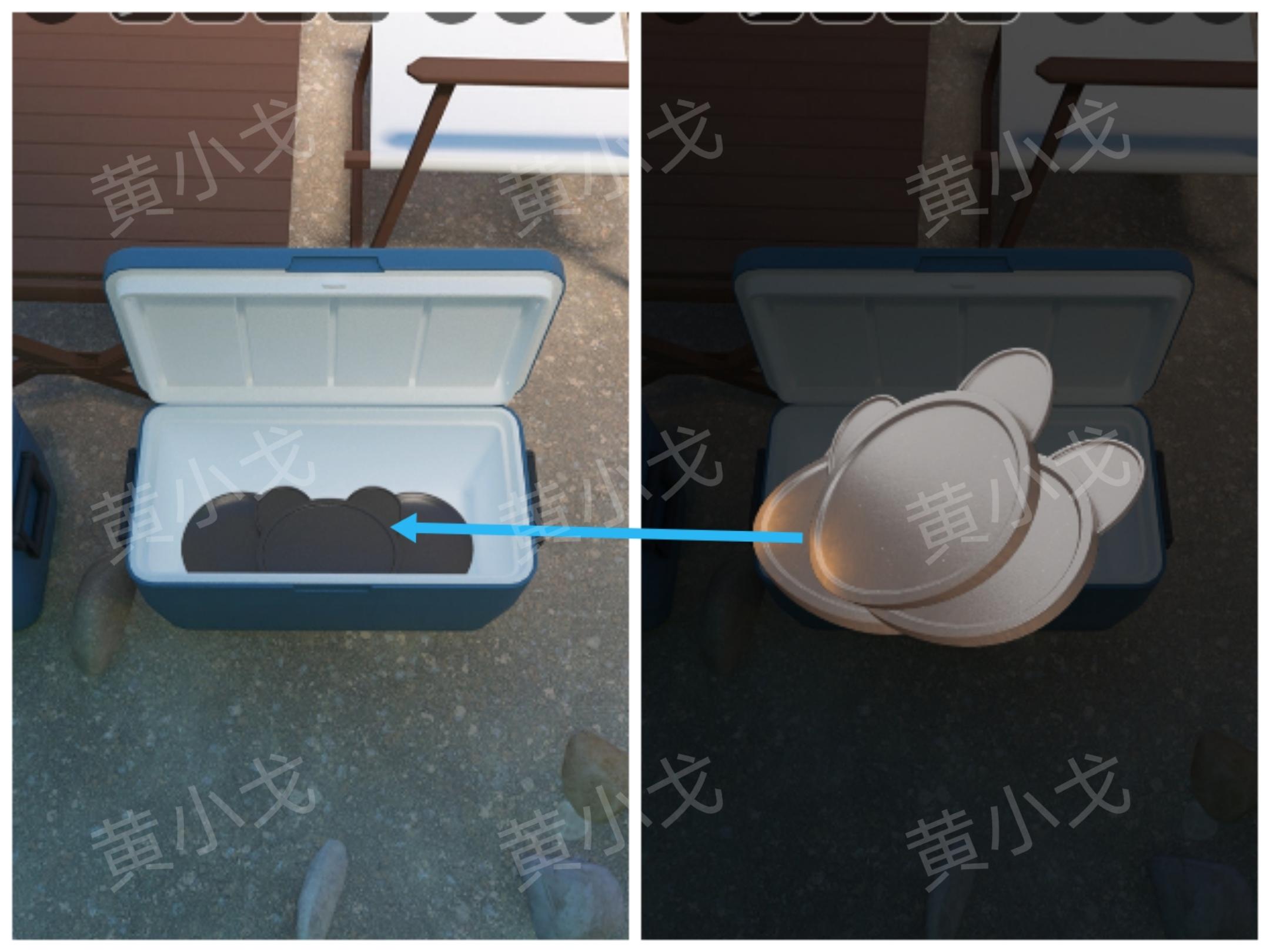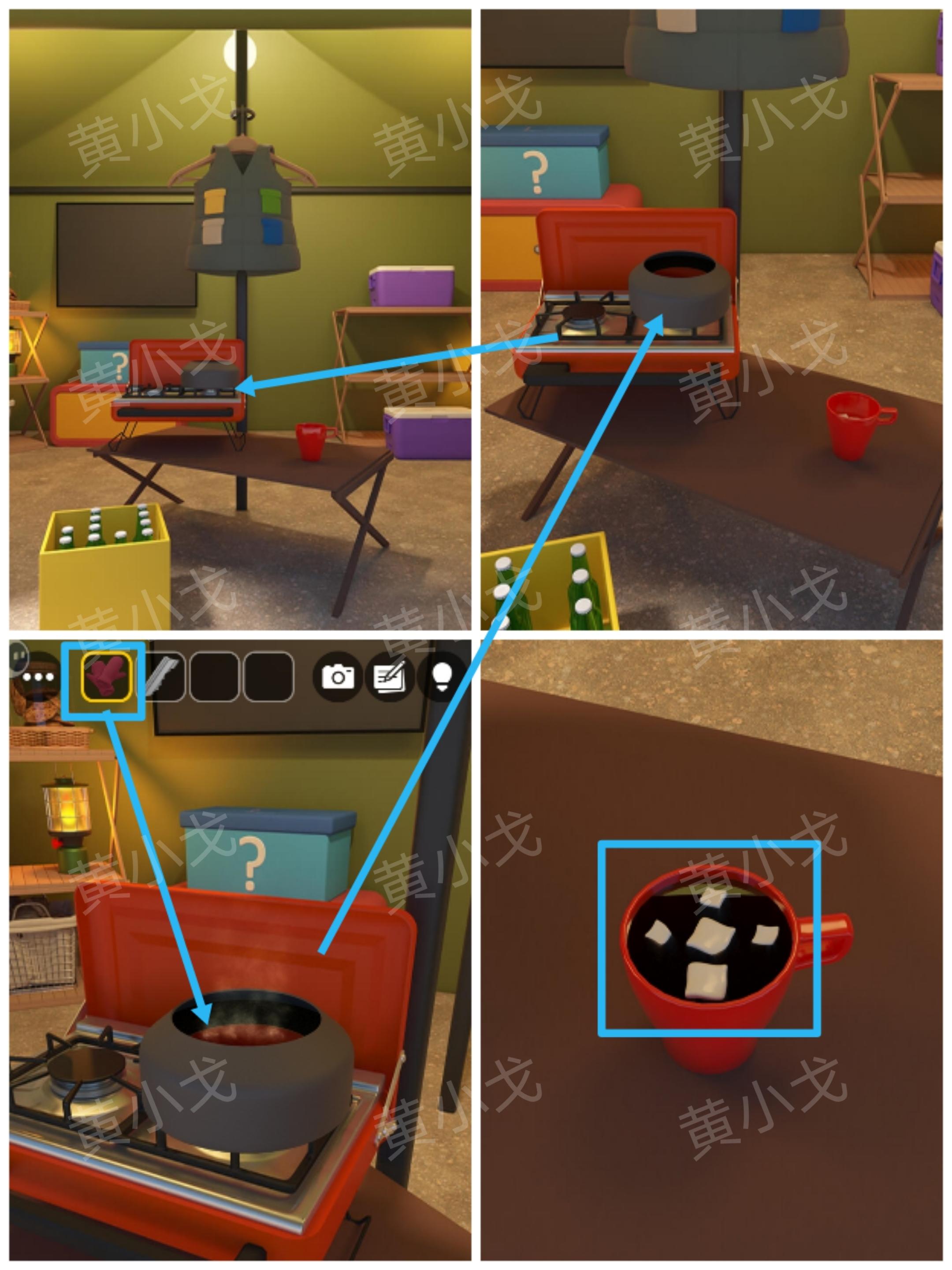 17.点击咖啡色桌子旁边的右侧箱子上的密码锁,根据[帐篷]场景杯子中的糖块大小及位置线索,调整密码锁