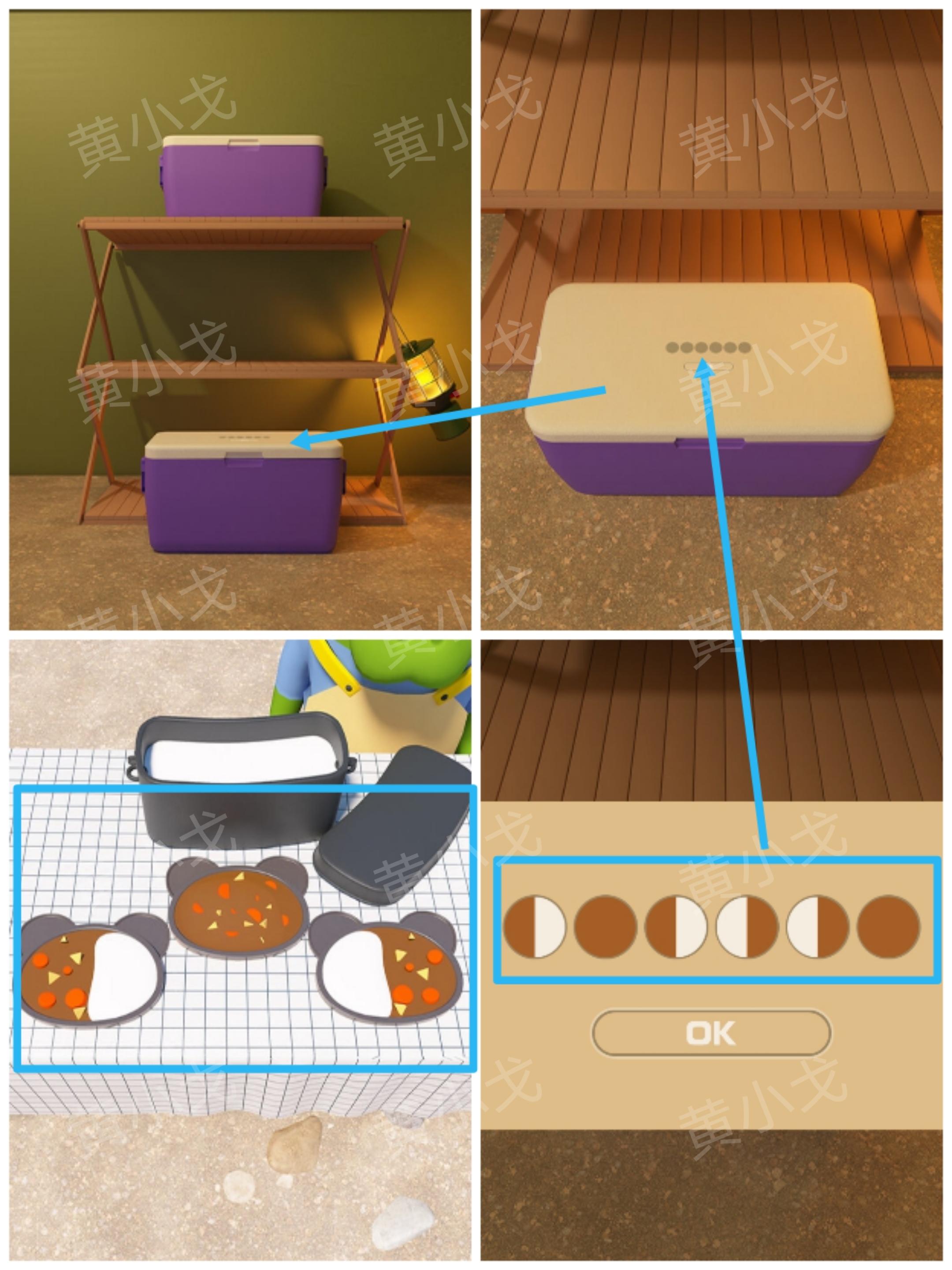 20.点击地上的紫色盒子,根据[大场景]盘子里的咖喱饭线索和小熊吃蜂蜜顺序,调整密码锁