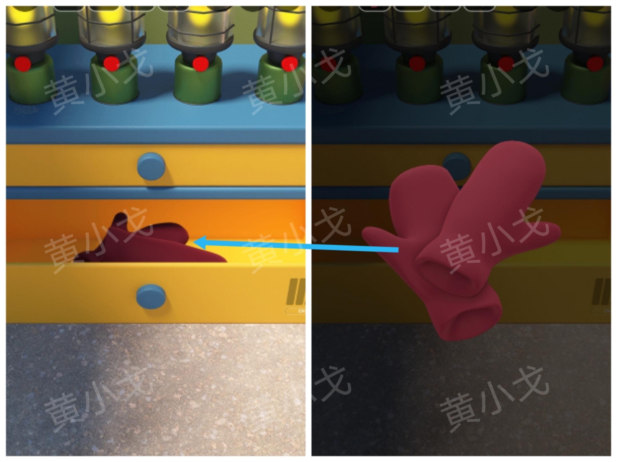 14.点击架子上的紫色盒子,根据[大场景]小猪手上的物品,调整密码锁
