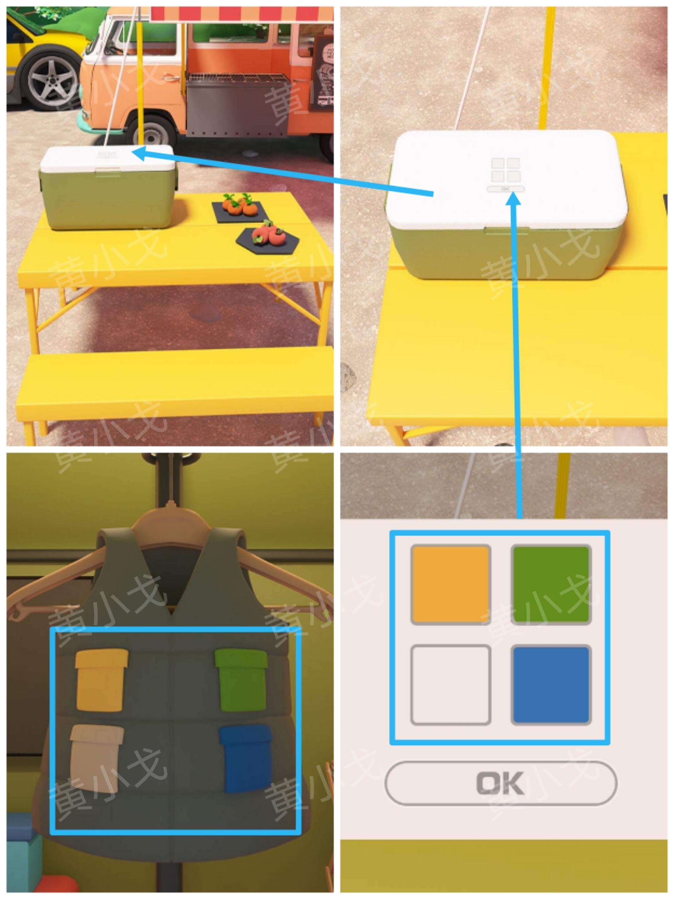 11.点击黄色桌子上的盒子,根据[帐篷]场景夹克口袋位置及颜色线索,调整密码锁
