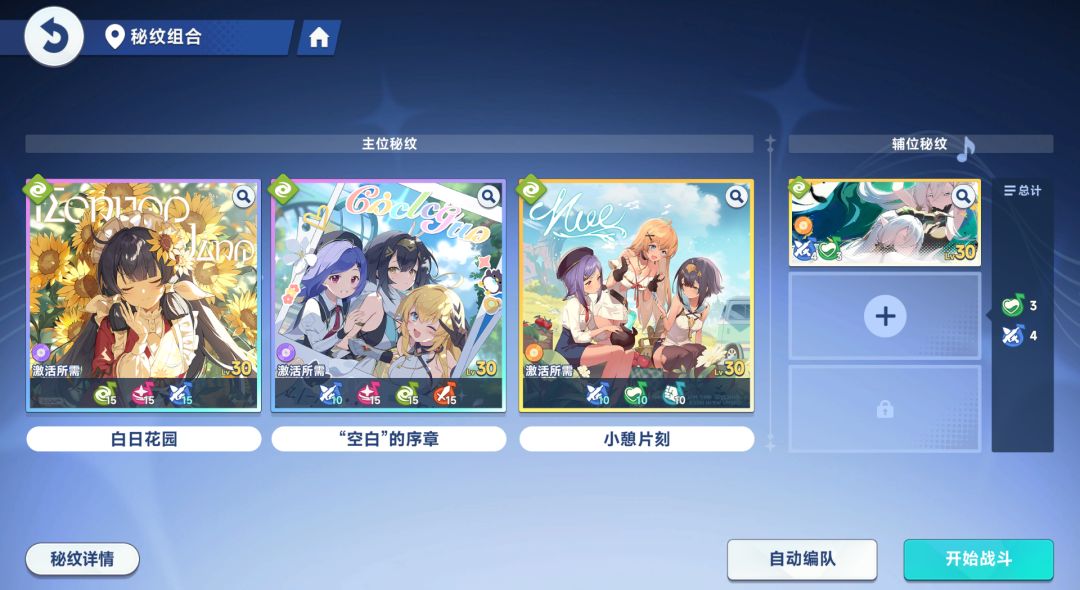 高星级的秘纹在拥有更高的面板的同时,还会有更多的羁绊组合,可以给队伍提供更高的上限。但是局内的音符掉落是比较随机的,这时候就轮到辅位秘纹了,辅位秘纹可以提供一些初始的音符,让你的关键羁绊更容易凑出来,通过点爬塔的科技树,最多可以携带三张辅位秘纹,大大提升凑出完美羁绊的可能性!
