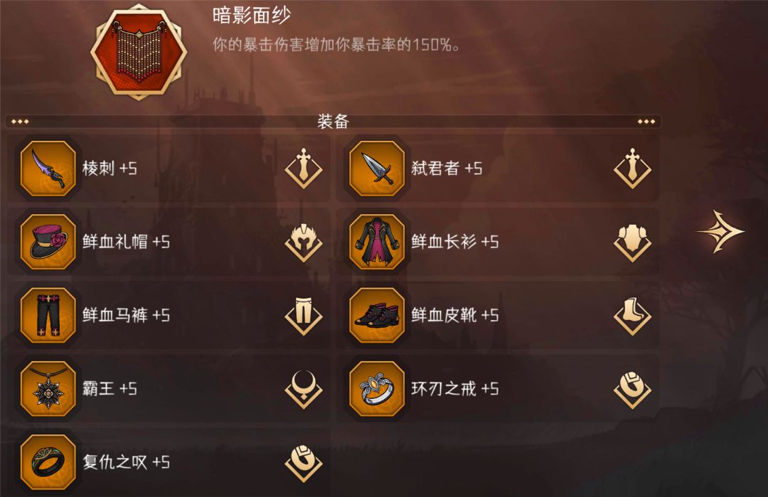 装备词条选择:所伤>暴击>命中,血刺是少有对命中要求很低的输出,鲜血武器能够提供高达70的命中,我一命血刺局外命中只有60,局内也基本能达到150以上命中。