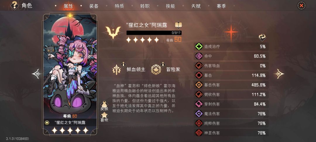 血弓目前是劈砍转血刺最适配的辅助,其具有极高的叠流血和削劈砍抗性的效率,正常情况下一回合就能叠满50层流血和70劈砍减抗。装备看你需求可以带元素使或者终焉套,元素使专职打辅助,坦度也比较高一点,终焉套可以辅助清小怪,我个人还是比较喜欢带终焉套,不然血刺前期请小怪真的太磨叽了。