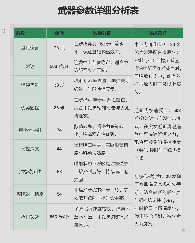 新手进阶过渡:后坐力控制与据枪稳定性数值较高,容错率适中,新手可通过该枪熟悉步枪弹道规律,提升控枪基础能力。