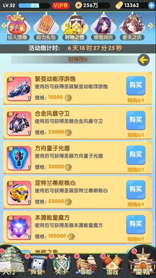 财神之壶界面新增财神商店,使用财神币可以兑换圣器等超多超值物品!在主角形象里圣器界面可以看到所获得圣器!圣器会增加仪容值和全体伤害!节日活动期间,挂机加速可额外掉落财神币!
