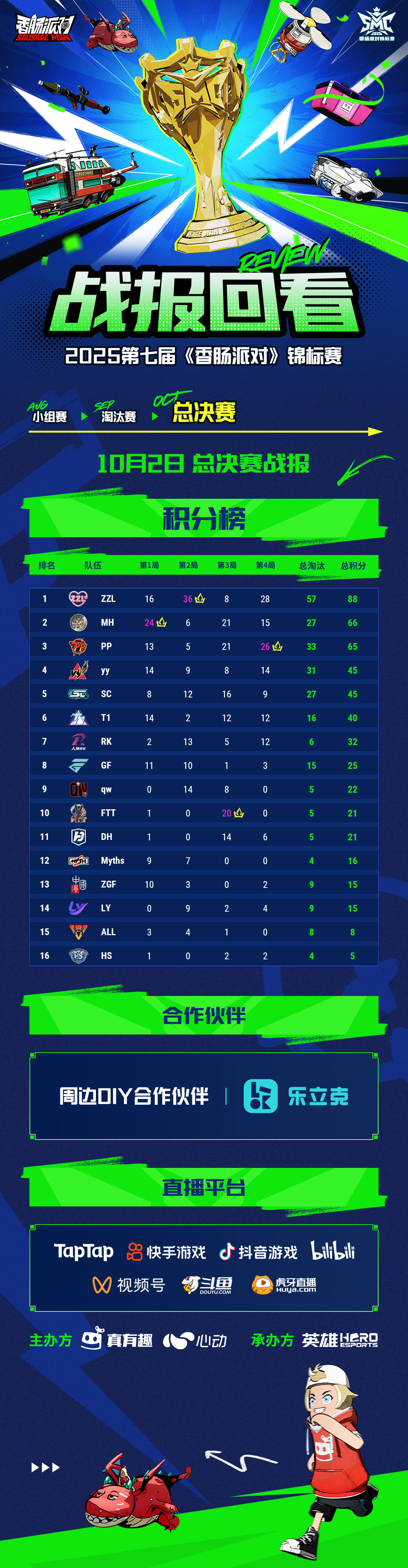 最终恭喜ZZL战队获得88分,拿下总决赛首日积分第一,决赛赛点定格为123分(88*140%向下取整)。明日任意战队积分达到123分后,再次拿下派对之王即可获得冠军,若6局比赛没有队伍在到达赛点后拿下派对之王,则积分最高者夺冠。