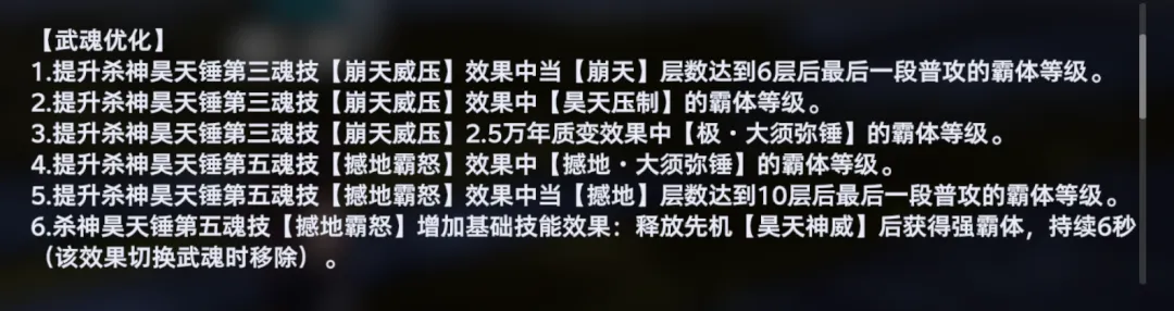 那么这波官方主要增强的点其实就一个......那就是给几乎所有的技能都套上了一个“霸体”的效果,那么霸体的意义就在于敌人用一些常规可以击飞或击倒我方角色的共计招式时,霸气状态下的我方角色就不会受到这些技能的影响,这点在之前的戴沐白身上大家应该已经有所体会。那么这个没有霸体所导致的问题就是唐昊的很多持续输出效果,尤其在PVP战斗场景下是很难能持续释放的,因此官方给新限定加这么个功能也能理解,不过又有朋友可能要问了,那为啥官方不给唐昊提升一下技能方面的强度呢?让其能够拥有更超越极限的实力。
