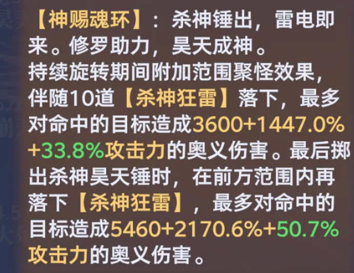 首先唐昊的神赐魂环在带到1技能猛兽系魂环上时,其最大的意义就是提供多个“杀神狂雷”的输出,这点倒是和之前锤三那个神赐魂环放到1技能奥义上的作用类似。那么这个神赐魂环在配合唐昊做主C时,其到底能为唐昊带来多大的增益呢?接着我们就来看实测对比:(以下的实测部分已经尽量剔除掉了暴击率和其余运气因素的影响,例如唐昊不带任何魂核,且其暴击率只有2%)
