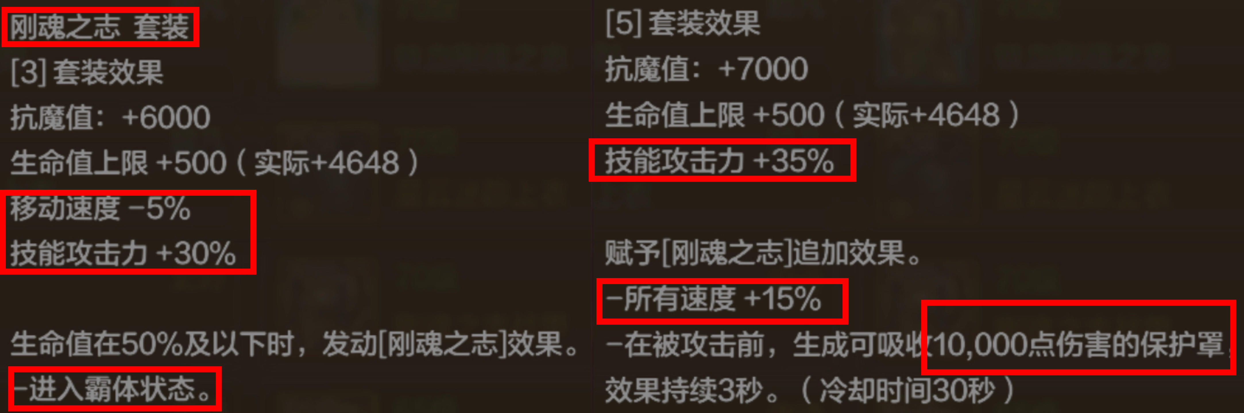 〔3件套〕抗魔值+6000、HP上限+500、技攻+30%、移速-5%、HP低于50%时发动霸体。