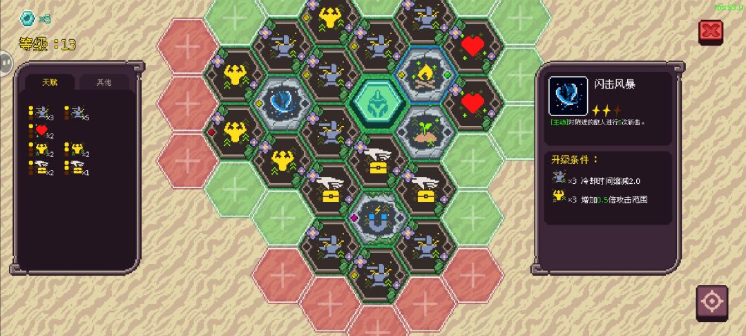 3.由于很多技能都是有六个升级条件,所以千万千万不要在开始就围绕着初始六边形上点技能,不然很多都无法升级,篝火因为只需要四个条件,所以一开始在初始六边形旁边点亮是没有问题的,依然能够解锁