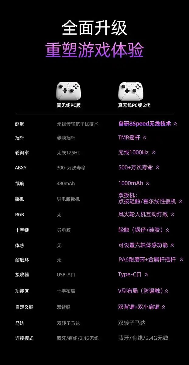 十字键采用锅仔与硅胶的轻触式开关。这种材质很奇妙,笔者感觉手感介于微动与导电胶直接,既有微动的清脆感,也有导电胶细微的弹性,这在市面上可以说独一档设计,让人不得不佩服八位堂的创新。ABXY键虽然仍然采用导电胶材质,但是将导电胶的质量做了一次全面升级,相较于一代,这款手柄的按键寿命高出了整整200万次,达到了500万次的寿命,几乎是一代的一倍之多。手柄芯片采用自研8Speed无线技术,在2.4G无线连接下,能达到惊人的1ms超低延迟,除此之外,通过自研天线技术+实时跳频算法,造就了这款手柄极强的抗干扰能力与稳定性,即使距离8米之远也能非常稳定的进行游玩,又快又稳,这谁不爱?