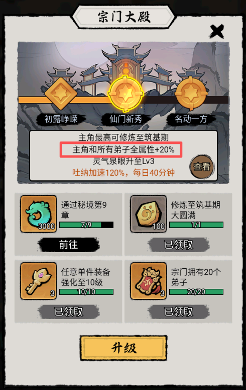 弟子升级或突破境界,均能够提升弟子的初始属性