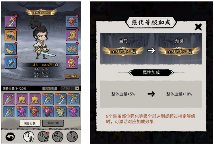 通过炼器、秘宝抽取、商店兑换、通关奖励可获取装备,提升装备等级可提高主角的基础属性,此外,全身的装备强化到指定等级可额外激活属性加成效果;