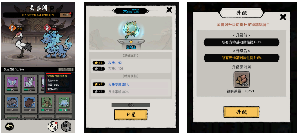 宠物、法宝升级/升星能够进一步提高加成效果;