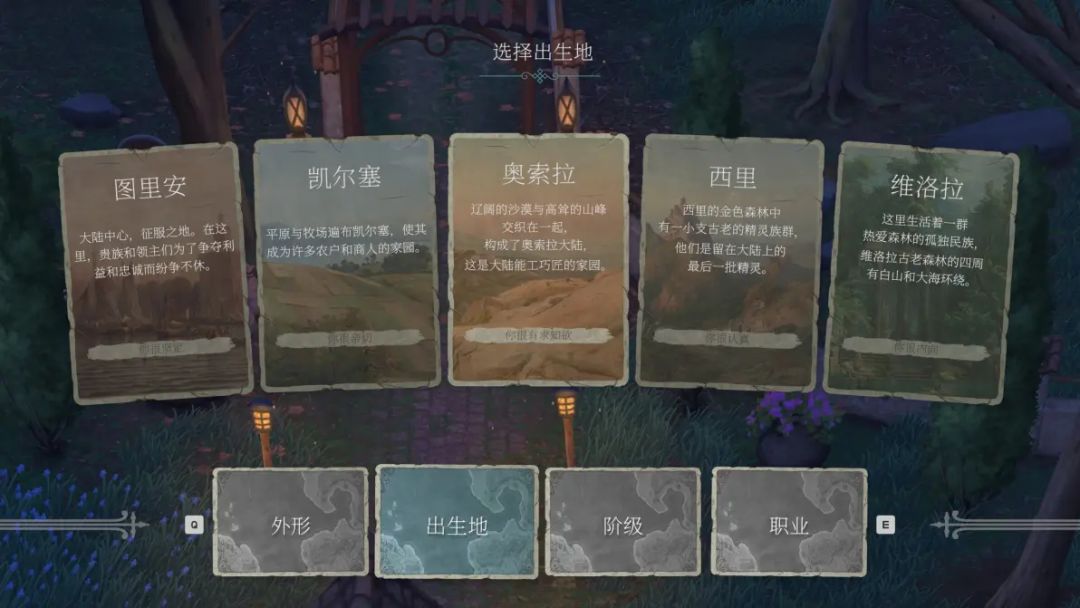 开局可以自定义人物外观、出生地、阶级和背景。出生地有图里安、凯尔塞、奥索拉、西里、维洛拉五种,对应坚定、亲切、求知、认真、内向五种性格,在游戏中暂时没发现有什么具体影响,大家可以按喜好选择。