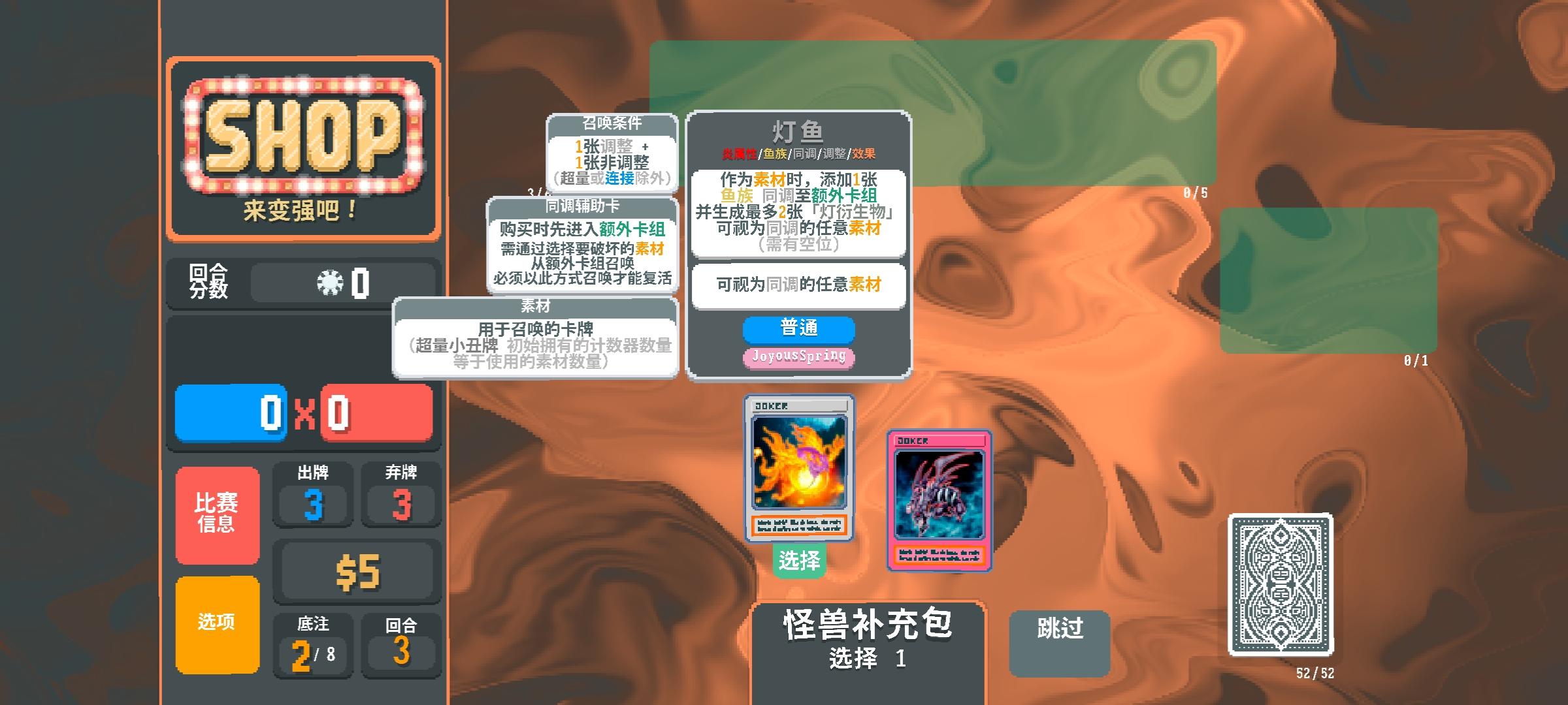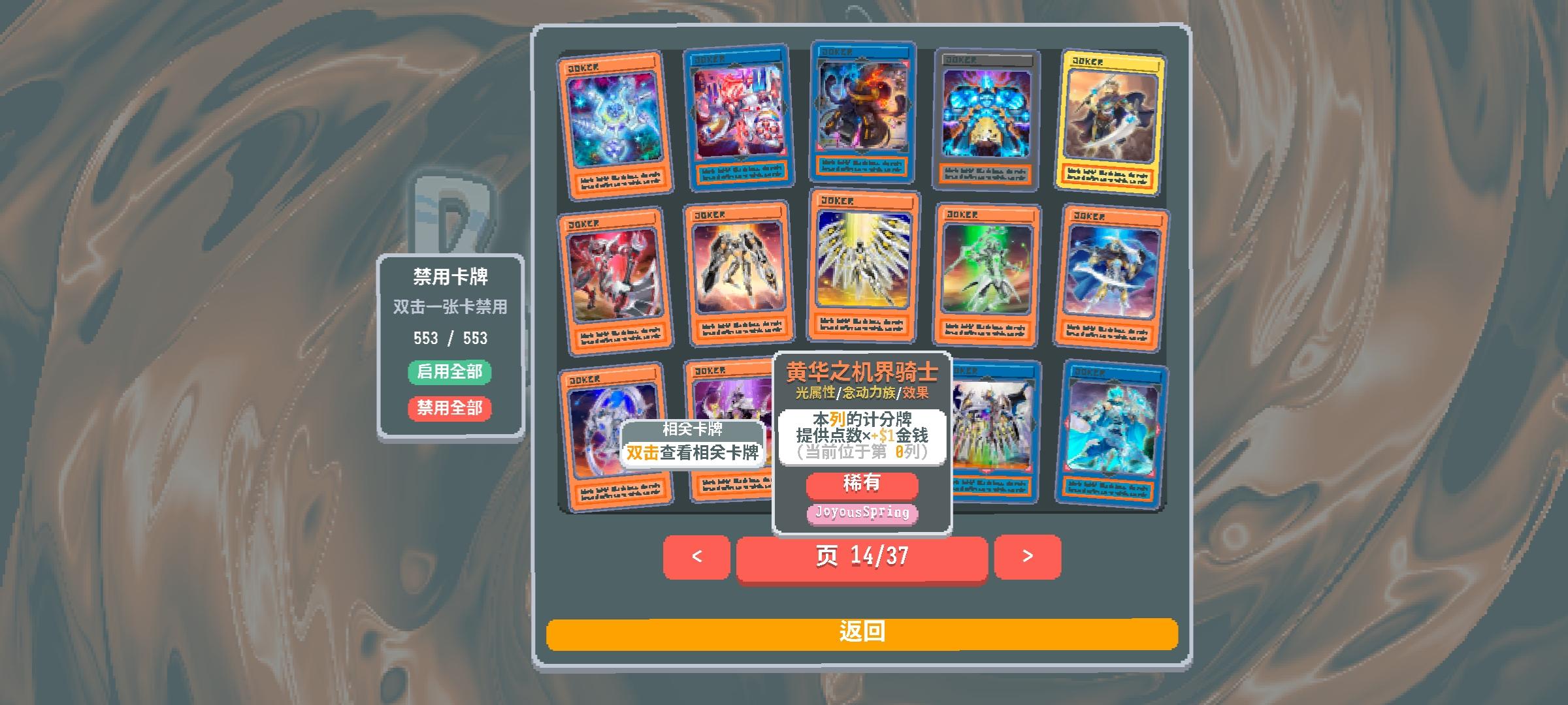 包含37个分类共403张独特的 类游戏王玩法小丑牌 游戏机制增加了独特的 墓地、除外区、额外卡组、场地魔法、 陷阱卡、翻转、横置、等玩法 还有主动技、召唤、融合、同调、 连接、灵摆等卡牌效果 新的牌型和挑战等内容 极大的丰富了可玩性和游戏探索内容。