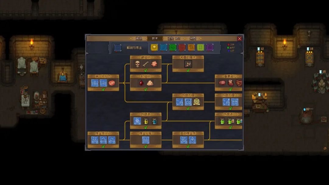 本作核心系统,解锁技能树需要科技点数,通过相应劳作获取,有红(伐木、采矿、锻造物品)、蓝(研究物品、修复墓地、炼金、读书、锻造特定物品)、绿(采集、种植)三种。